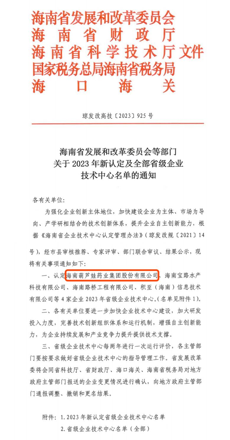 近日,海南省发改委等多部门联合公布了《关于2023年新认定及全部省级企业技术中心名单的通知》,其中,海南拉斯维加斯9888药业集团股份有限公司成功通过评审,被认定为省级企业技术中心,是本次获批的4家企业之一。